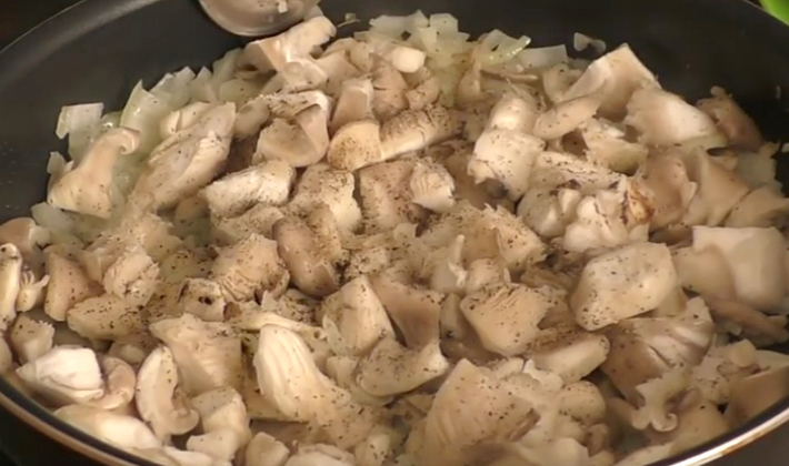 - Couper les champignons en morceaux, les mettre dans une poêle avec de l'huile chauffée et les faire revenir jusqu'à ce qu'ils soient dorés.