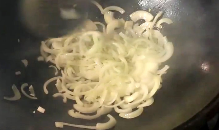 - Épluchez l'oignon, coupez-le en cubes et faites-le frire dans l'huile jusqu'à ce qu'il soit doré.