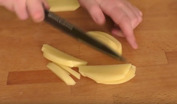 La pomme de terre est pelée, coupée en fines tranches ou en cubes et cuite dans une croûte délicieuse dans la même huile que l'oignon.