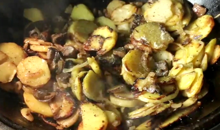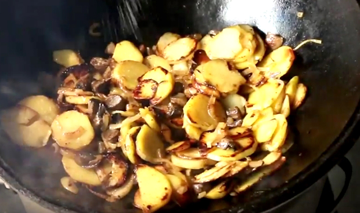 Des champignons et des oignons sont ajoutés aux pommes de terre, assaisonnés avec du poivre moulu et du sel, mélangés.