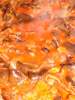 - Versez la sauce dans les champignons avec les oignons, remuez et faites frire pendant 15 minutes avec le couvercle ouvert. à feu doux.