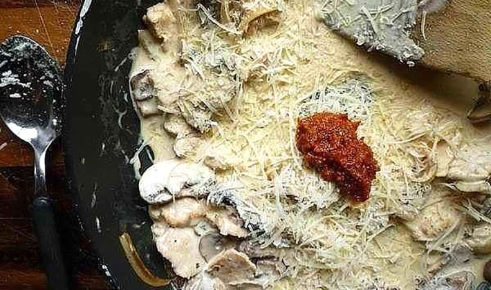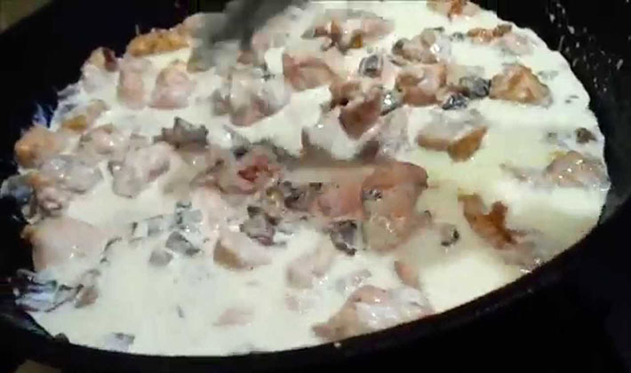 Une fois que les champignons sont prêts, ajoutez la crème dans la casserole, amenez à ébullition et envoyez la poitrine de poulet déjà préparée dans le mélange obtenu.