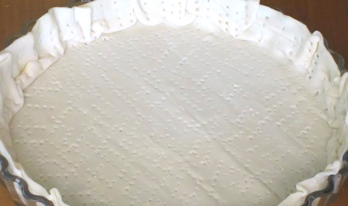 Mettez le mélange que vous venez de préparer sur la pâte, puis couvrez la tarte avec une deuxième feuille de pâte, graissez-la avec un œuf. Sur toute la surface, faites de petites perforations avec une brochette ou un cure-dent. Le gâteau sera cuit pendant environ 20 minutes dans un four préchauffé à 180 degrés.