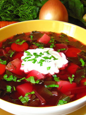 Faire bouillir les champignons et hacher, filtrer le bouillon. Faire bouillir les oignons, les carottes, le suédois et les pommes de terre. Cuire les betteraves ou les faire bouillir, les hacher. Mélanger tous les produits, ajouter la feuille de laurier, faire bouillir, saupoudrer d'herbes hachées et colorer le jus de betterave.