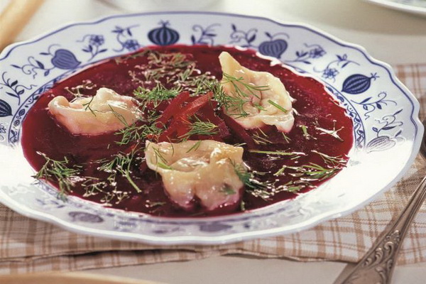 Hacher les cèpes, cuire à l'eau bouillante salée. Hachez le dessus et faites bouillir dans de l'eau bouillante salée. Faites dorer la farine avec 1 c. à soupe d'huile, mélanger avec les cèpes, le dessus et leur décoction, faire bouillir. Ajoutez 1 c. cuillère d'huile, 100 g de crème sure, sel, jus de betteraves râpées.
