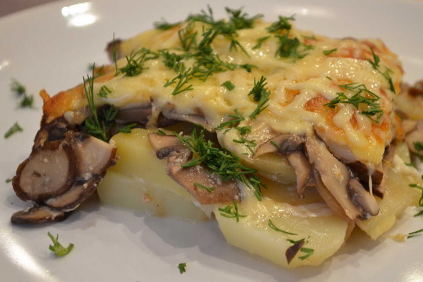 - Nous avons réparti les champignons sautés sur les pommes de terre semi-finies. Mélanger.
