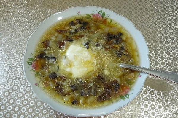 Après cela, jetez les oignons et les carottes dans la soupe. Cuire à feu moyen pendant environ 20 minutes. 15 minutes avant la cuisson, ajoutez la feuille de laurier et salez la soupe. N'oubliez pas de retirer le laurier, servez la soupe avec des pommes de terre et des champignons sauvages bien chauds.