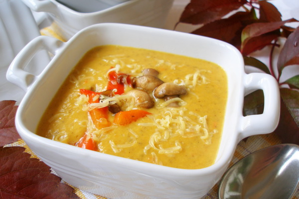 - Faites frire ½ oignon, céleri, carottes, ail, citrouille en dés, pommes de terre et tous les champignons hachés dans une olive et du beurre pendant 15 minutes. Saler, ajouter le poivre noir et les herbes de Provence.