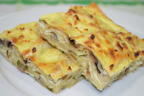 Tapisser le fond du pain pita avec une forme résistante à la chaleur, graisser avec une sauce à la crème sure, saler et poivrer. Parsemer d'oignons quelques champignons et parsemer de demi-mozzarella. Recueillez les couches de lasagne restantes de la même manière sans utiliser de fromage.