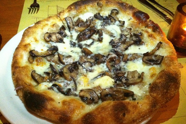 Pizza aux champignons cuite à la maison selon cette recette et servie avec du parmesan râpé.