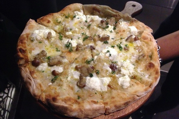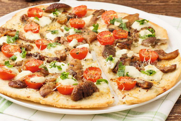 Pizza aux champignons, tomates cerises et sauce à l'ail