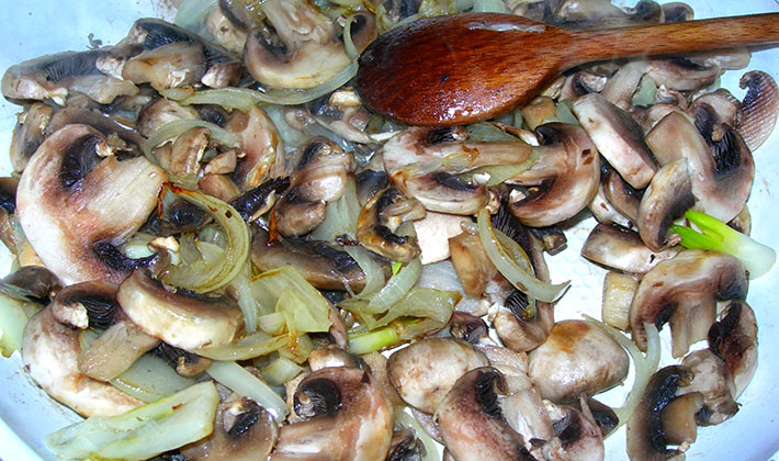 - Faites frire l'oignon, ajoutez les champignons et faites-les frire jusqu'à ce qu'ils soient rosés.