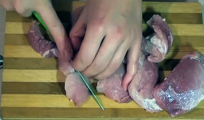 - Bien rincer la viande, battre un peu avec un marteau de cuisine, couper en lanières, mettre dans une casserole avec un peu d'huile et faire frire jusqu'à coloration.