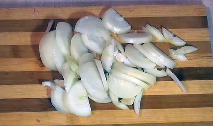 - Épluchez les oignons, coupez-les en demi-rondelles, versez-les dans les fructifications, versez-les dans l'huile d'olive et faites-les revenir pendant 10 minutes en brassant constamment.