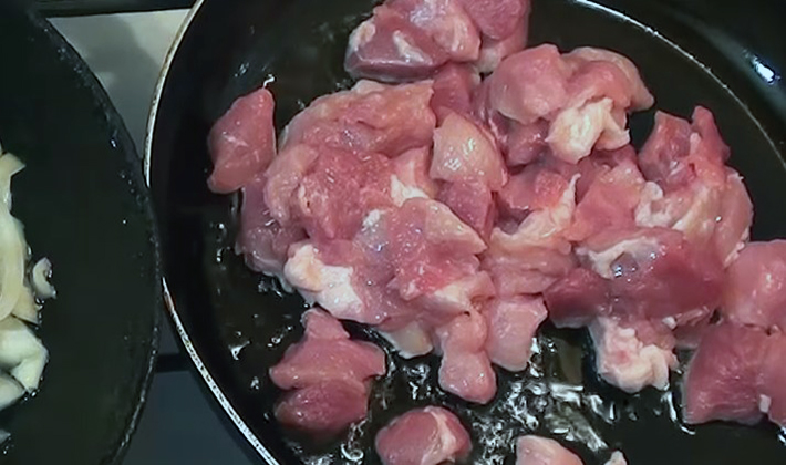 - La viande est préparée dans une casserole avec de l'huile chaude, frite pendant 10 minutes. à feu moyen.
