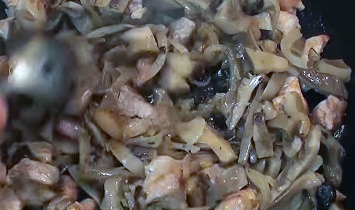 - Faire frire les oignons épluchés et hachés, et dès qu'ils deviennent tendres, les mettre dans le boeuf.
