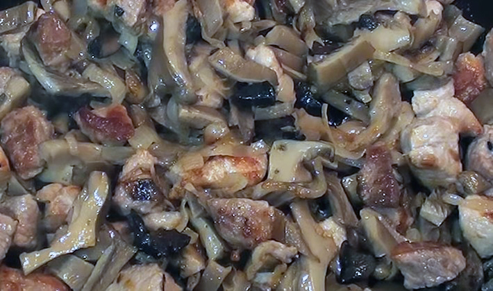 - Frire pendant 10 minutes. dans une poêle séparée avec 2 c. l champignons coupés en dés, verser dans la viande.
