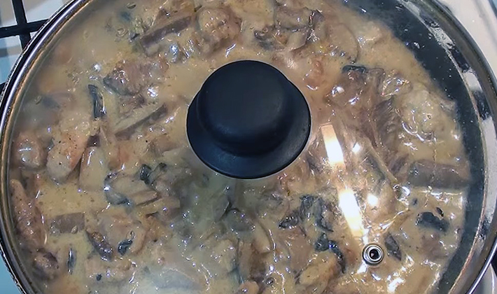 - Verser sur la viande et les champignons, laisser mijoter 15 minutes à feu doux.