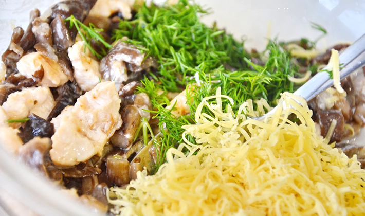 Farce. Jeter les champignons dans de l'eau bouillante salée, amener à ébullition, puis sécher et faire frire dans l'huile végétale jusqu'à tendreté. Frottez le fromage sur une râpe fine.