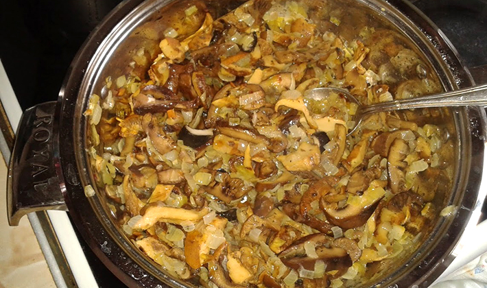- Épluchez les champignons, rincez-les, hachez-les finement, faites-les frire avec des oignons émincés dans de l'huile végétale.