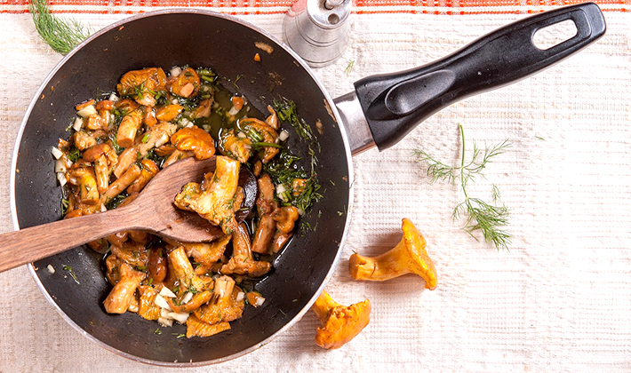 Peler, hacher et faire revenir l'oignon, ajouter aux champignons avec la crème sure.