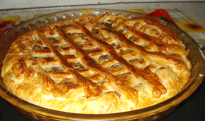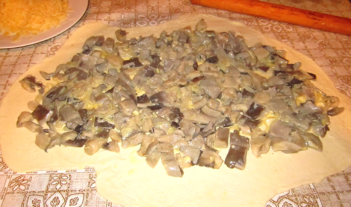 Le remplissage de la tarte avec des champignons, du fromage et des herbes est assez exotique - cela inclut les abats.
