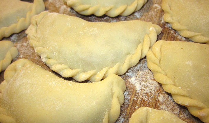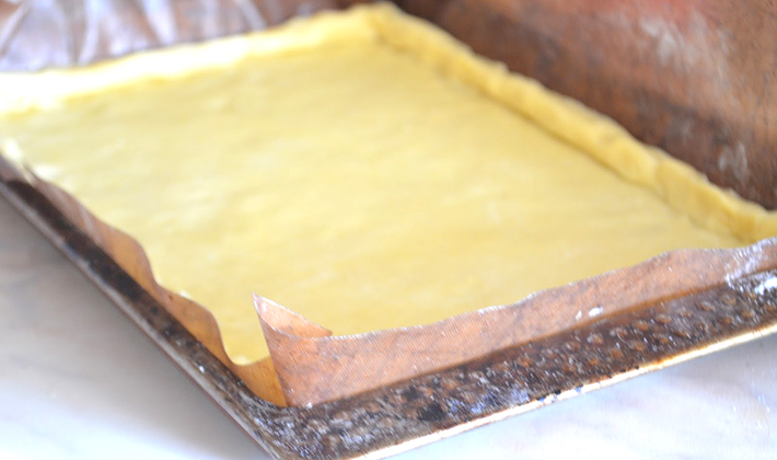 De la farine, de la margarine, des œufs, de l'eau, du sel, du soda, pétrir la pâte fraîche, étendre deux couches.