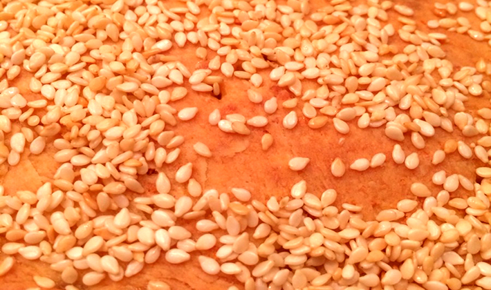 Maintenant, nous faisons des coupes en diagonale, nous huilons avec du jaune et saupoudrons de graines de sésame.