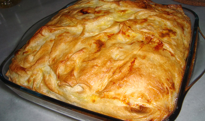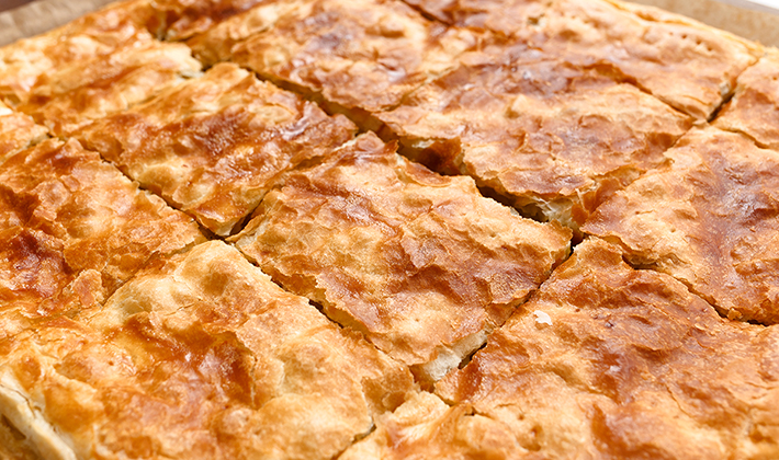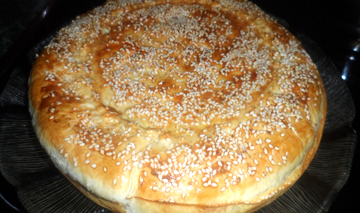 Pétrir la pâte, la couper en deux, rouler les deux côtés en cercles, mettre une partie de la pâte étalée dans un moule graissé à l'huile végétale, fabriquer les côtés, mettre la farce sur la pâte, couvrir avec la deuxième partie de la pâte étirée et bien pincer les bords.