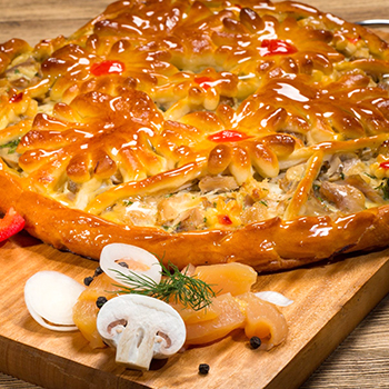 - Étaler 2 couches de la pâte et en déposer une sur une plaque à pâtisserie recouverte de papier sulfurisé. Graisser la pâte avec de la mayonnaise, mettre les champignons, la viande et le fromage, couvrir de la pâte. Cuire jusqu'à coloration dorée.
