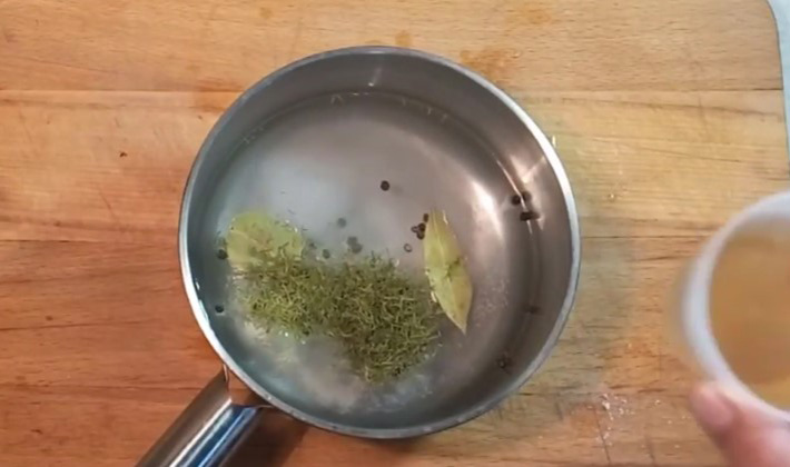 La marinade est préparée: le sel et le sucre, ainsi que toutes les épices, à l'exception du vinaigre, sont combinés dans de l'eau.