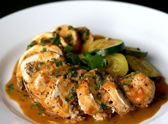 Pour commencer, consultez la recette et les photos de rouleaux de poulet aux champignons et à la roquette en sauce.