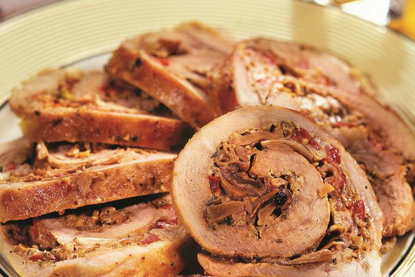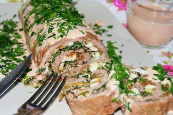 Lavez et séchez la longe, enlevez tout ce qui est inutile. Couper en tranches, bien battre, saler et poivrer. Mettez un peu de farce sur chaque tranche de viande. Rouler, rouler dans la farine. Faire frire dans l'huile d'olive des deux côtés pendant 1-2 minutes.