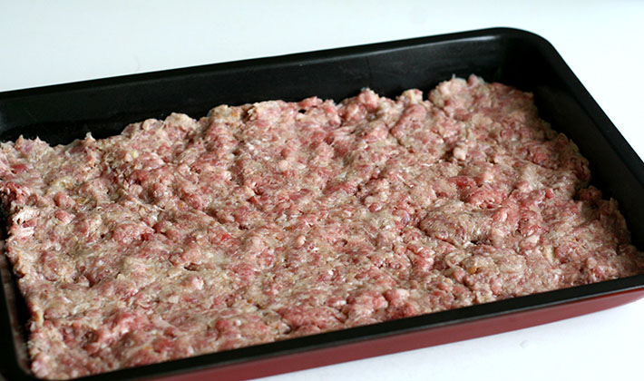 Farcir la viande hachée en couche uniforme sur une plaque à pâtisserie. Le fond ne peut pas être huilé. Saupoudrer d'aneth sec et de sel.