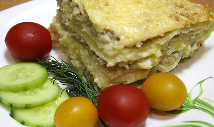 - Diluer la crème sure avec du lait. Dans une plaque à pâtisserie graissée de beurre, déposer les pommes de terre, un peu de viande hachée, sur des oignons émincés, des champignons, puis à nouveau de la viande hachée et des champignons restants, verser le plat avec la crème sure. Nous envoyons le plat à cuire au four. Cuire au four pendant cinquante minutes à 170-190 C.