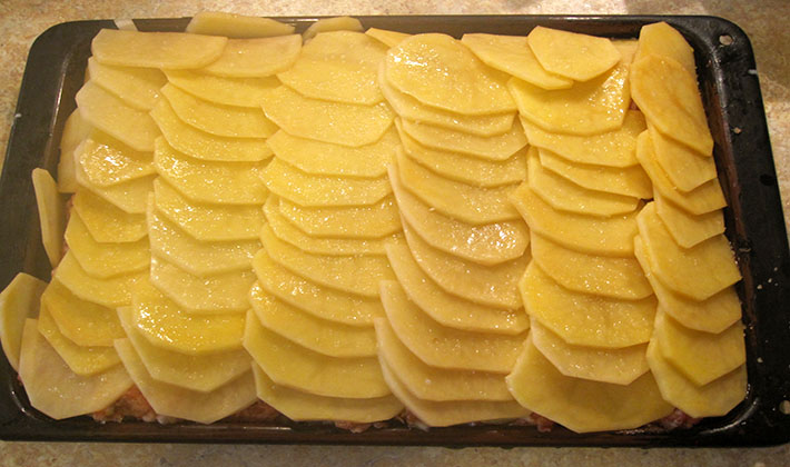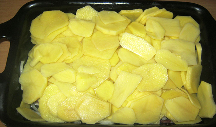 Étendre une couche de pommes de terre sur le dessus. Mieux couper en fines tranches. Puis salez encore un peu.