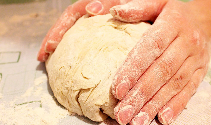 Préparation de la pâte pour une tourte fermée avec viande, champignons et fromage: à partir de 4 tasses de farine, levure et 1 tasse de lait, fermer la pâte. Bien pétrir et mettre dans un endroit chaud pour la fermentation.