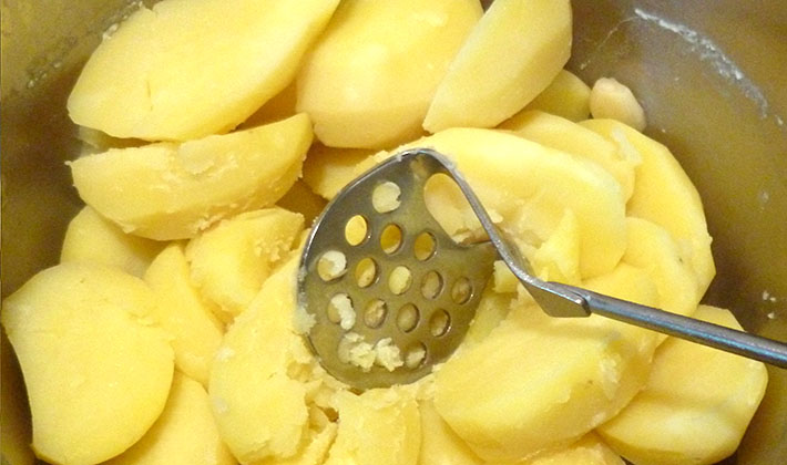 Épluchez les pommes de terre, rincez-les, mettez-les dans une casserole d'eau et mettez le feu. Nous faisons de la purée de pommes de terre à partir de pommes de terre bouillies. Dans la purée de pommes de terre, ajoutez le beurre et 1 œuf. Bien mélanger le tout et laisser refroidir.