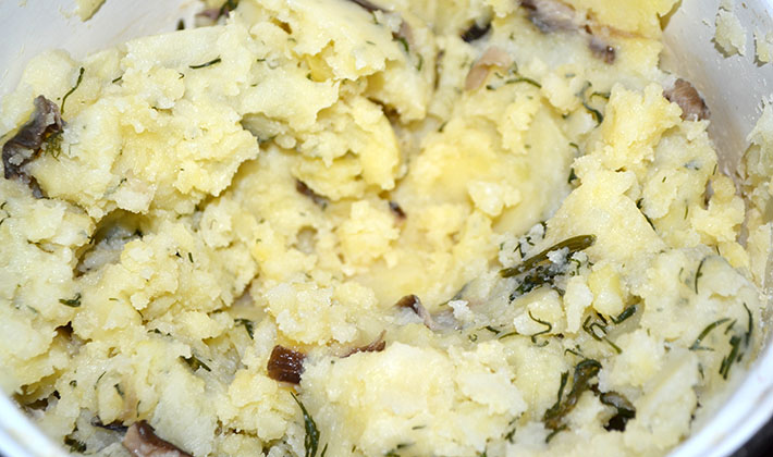 Nous combinons la purée de pommes de terre avec les champignons, le sel et le poivre, vous pouvez verser un peu d'aneth.