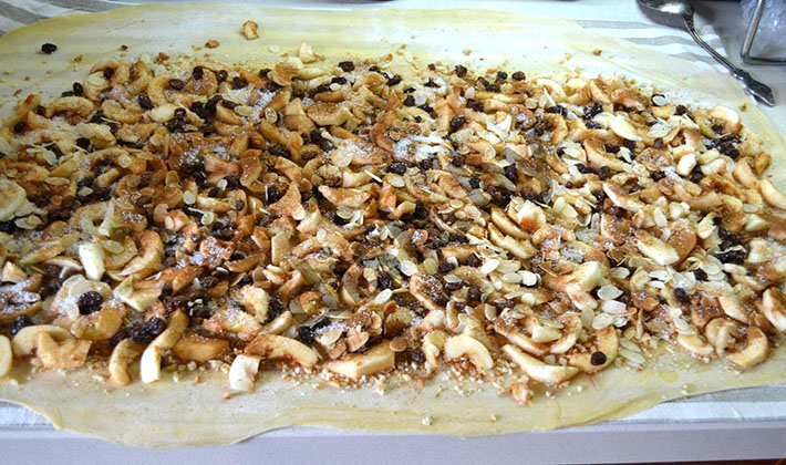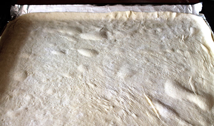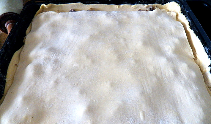 Abaisser la pâte en une couche en séparant un petit morceau. Mettez le gros de la pâte dans une plaque à pâtisserie graissée et posez la garniture dessus.