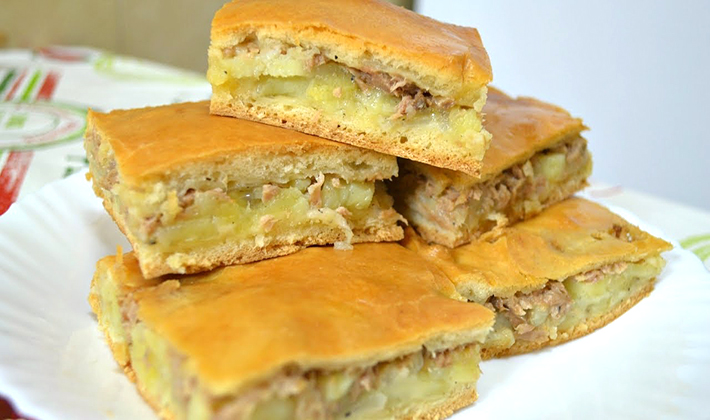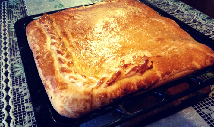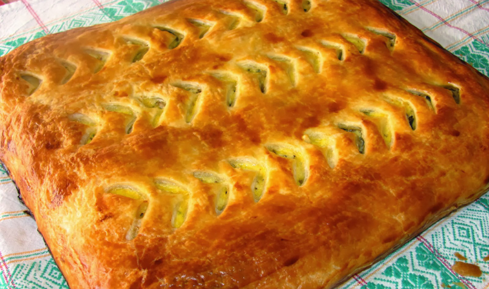 Abaisser la pâte en deux couches: l'une est beaucoup plus grosse que l'autre. Disposer une couche plus grande dans un moule ou sur une plaque à pâtisserie recouverte de papier sulfurisé huilé, former de grands côtés. Répartissez le remplissage, recouvrez d'une deuxième couche de pâte, pincez bien les bords. Au centre, faites des trous pour que la vapeur s'échappe. Lubrifiez la surface avec un mélange de jaune et de lait. Cuire le gâteau au four jusqu'à ce qu'il soit doré (50 à 60 min).