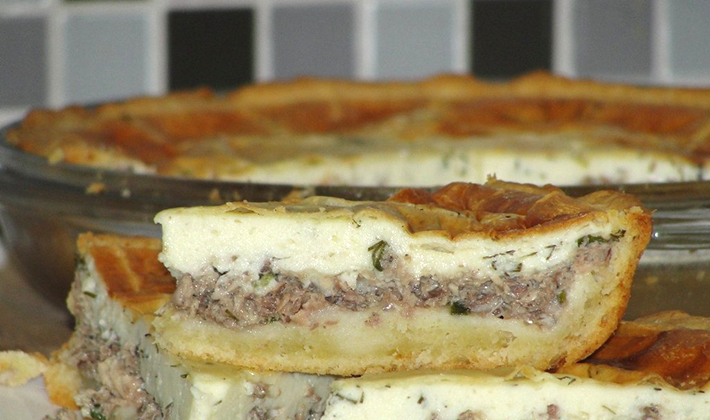 Divisez la pâte décongelée en deux parties égales et roulez-les. Déposer une partie sur une plaque à pâtisserie graissée à l'huile végétale. Étaler la garniture sur le dessus et couvrir avec le reste de la pâte. À la tourte fermée, pincer délicatement les bords, badigeonner du reste de l’œuf battu et hacher à plusieurs endroits à la fourchette.