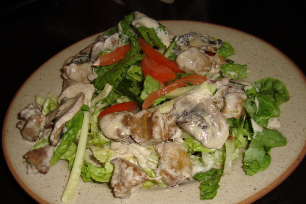 Il est à noter que cette salade est préparée avec du poulet et des pleurotes frits. Il peut être servi seul ou avec de la purée de pommes de terre.