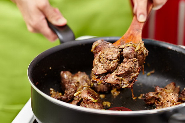 Épluchez l'oignon, faites-le frire jusqu'à ce qu'il soit tendre, puis mélangez-le à la viande et aux champignons.