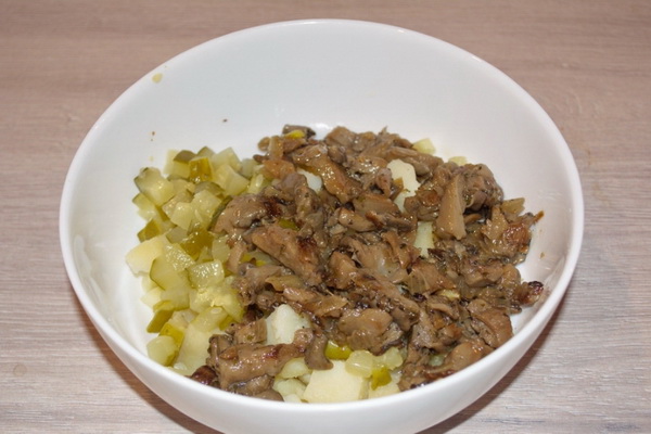 Laisser refroidir, couper en petites tranches, mélanger avec les champignons dans un bol séparé.