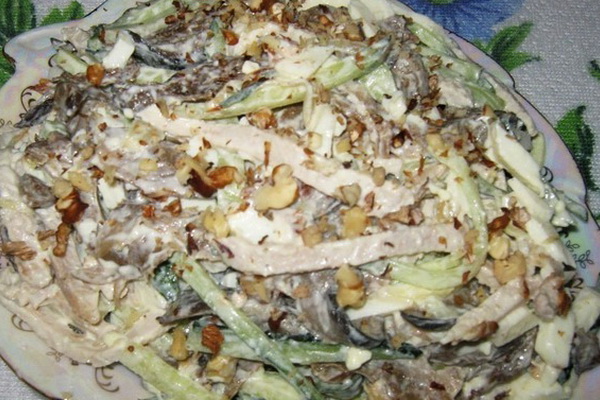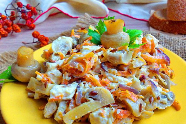 Il est à noter que cette salade aux pleurotes peut être préparée avec du poulet fumé, le goût et l'arôme du plat changeront, mais cela n'affectera pas la qualité.