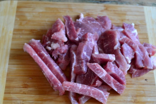 Couper la viande bouillie en petites tranches et les introduire dans la salade.