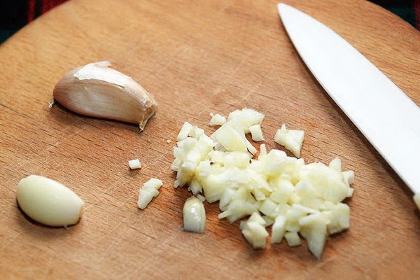 Écraser l'ail avec un couteau, mélanger avec du vinaigre de cidre, du persil haché et mélanger.