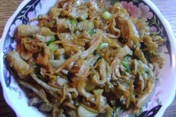 Une telle salade coréenne aux pleurotes peut être accompagnée de spaghettis ou de pommes de terre bouillies.
