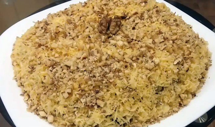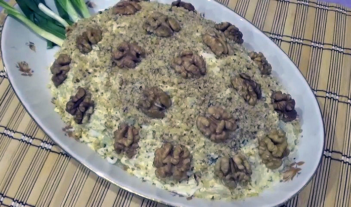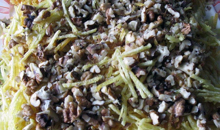 - Mettez dans un bol à salade, saupoudrez de noix hachées et servez.